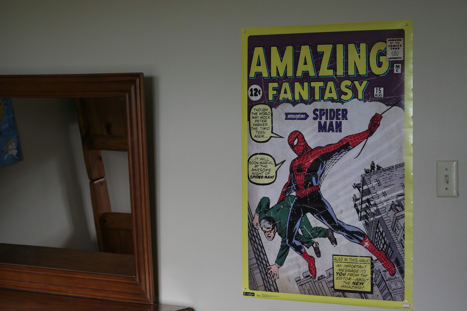 The colors I chose for the boys’ room were tan for the walls (“Oat Straw” to be exact) with navy, red, and white accents. We got some vintage-feel superhero posters, as well as some sports posters, and a map Elias picked out.