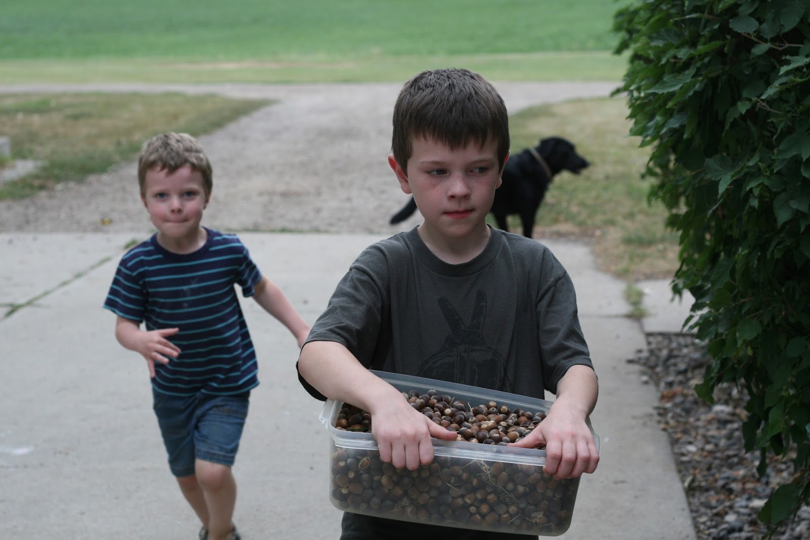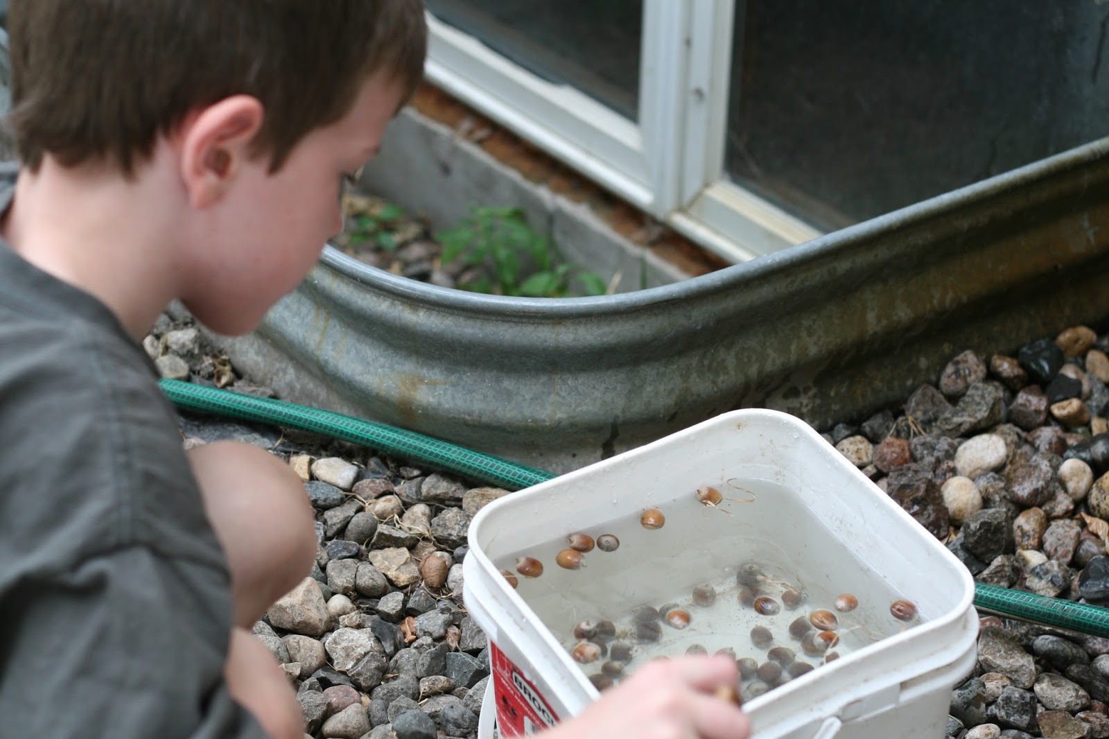 First we took his acorns, and dropped them in water to see if they would float. The sinking ones are supposed to germinate, and the floating ones are already “dead.” This picture is just of him starting out. We filled this bucket with acorns multiple times.