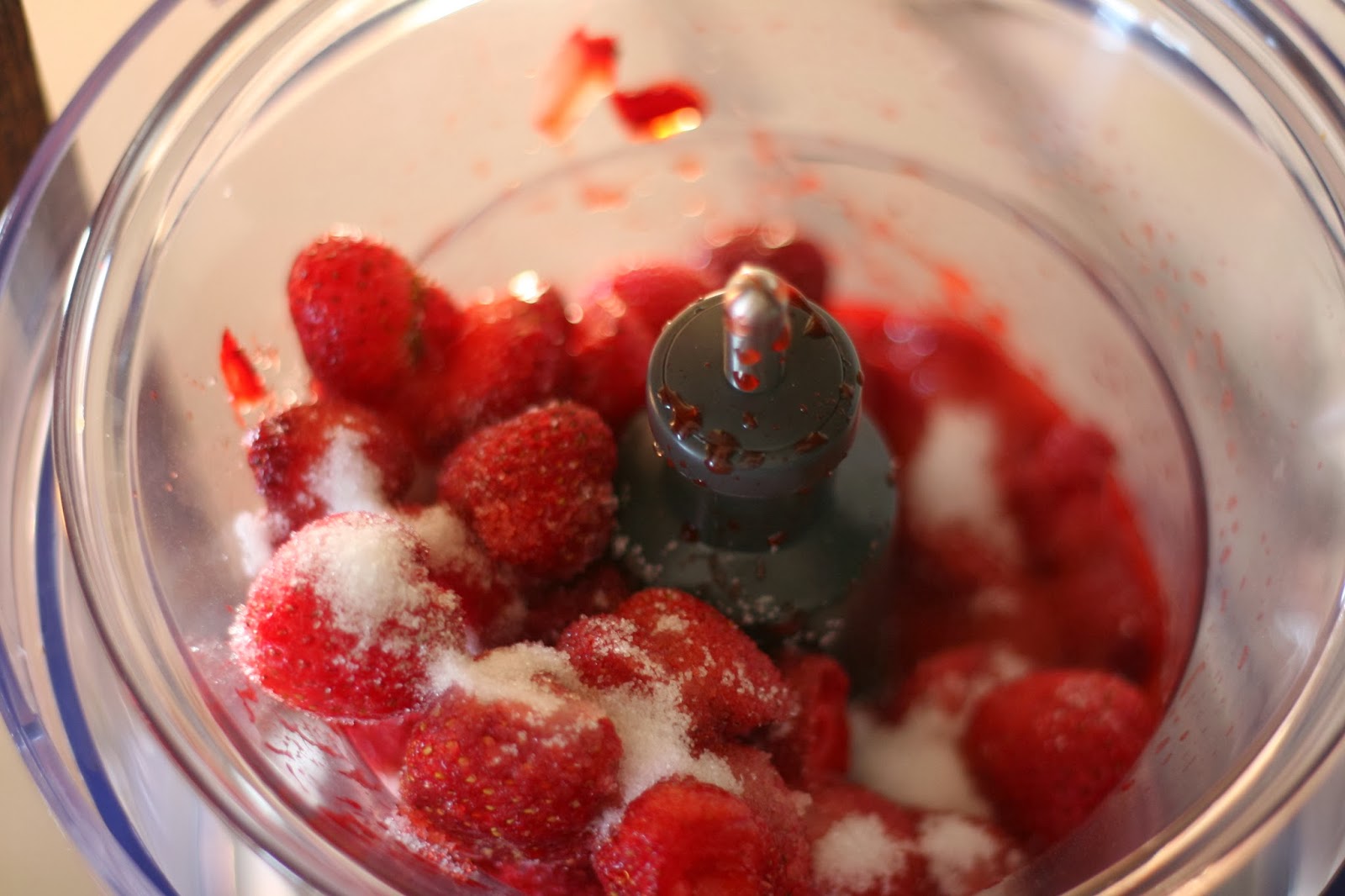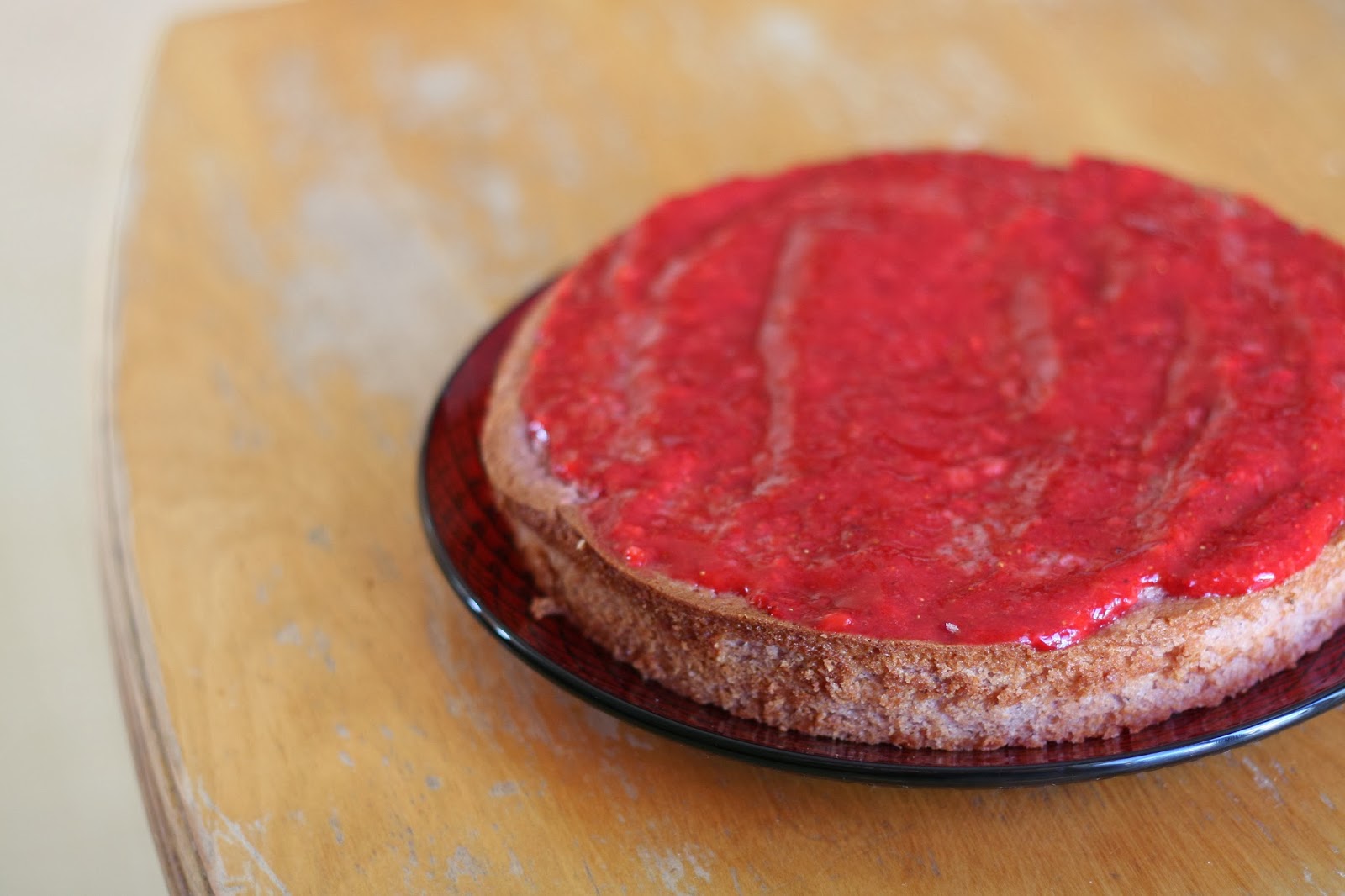 I used pureed strawberries with sugar as the filling, and then did a cream cheese frosting with added strawberry puree for color and flavor. Then I stuck strawberries on top and drizzled the yummy, sugary juice all over. It was messy but worth it.