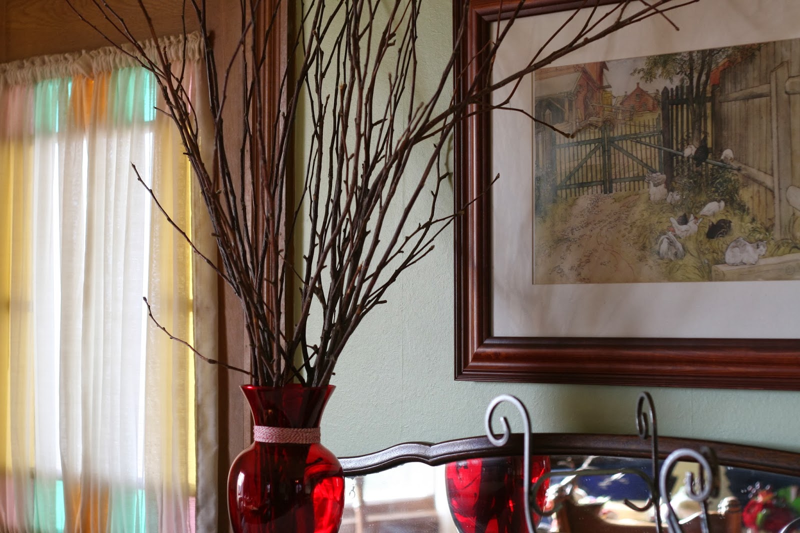 This is our Jesse Tree. Once our ornaments start going up, I’ll show what it looks like as it gets prettier. It’s just some branches pruned off our apple tree that I saved in the garage for a project I never go to. Next weekend we’ll probably get to cutting down a Christmas tree. Other than that, most of the house is decorated now. I just couldn’t wait any longer.