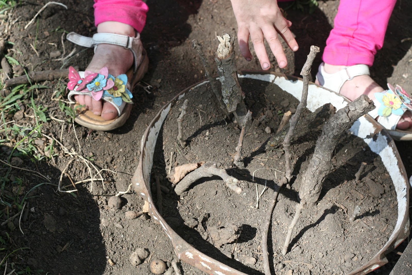 On one side of the summer kitchen there’s a pretty antique rose bush, and a piece of dirt that is mostly shaded and I have managed to kill years worth of flowers that I can’t seem to get to take root with it’s rocky foundation. As I was debating which kind of flower would meet a slow death in this spot this year, I had an epiphany. Nothing is ever here but dirt. Therefore, it would be an ideal spot for a mudpie kitchen.