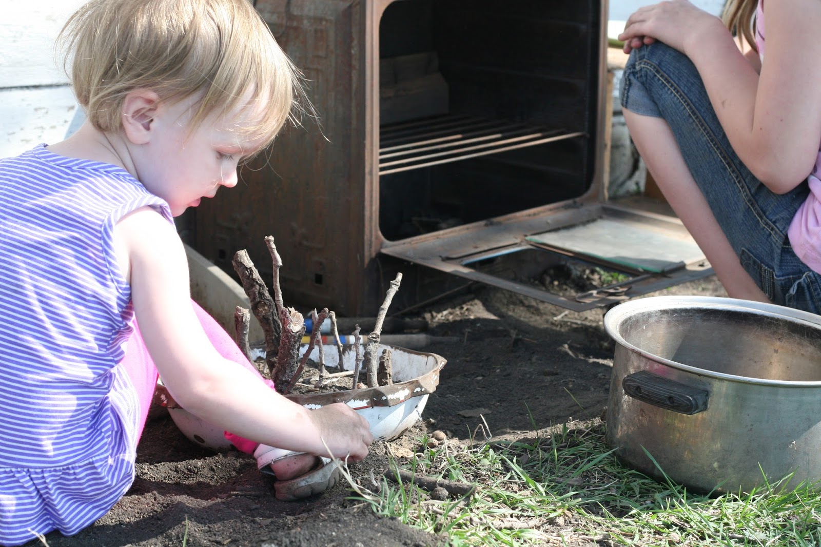 I executed this plan very sloppily as I was working in the garden and the 2 little girls were getting underfoot. I asked Silje to set up some “furniture” using some old wooden boxes and drawers inside the summer kitchen for some kitchen furniture. She brought out the old metal bowls and pots. I could tell she didn’t know what I meant by furniture.